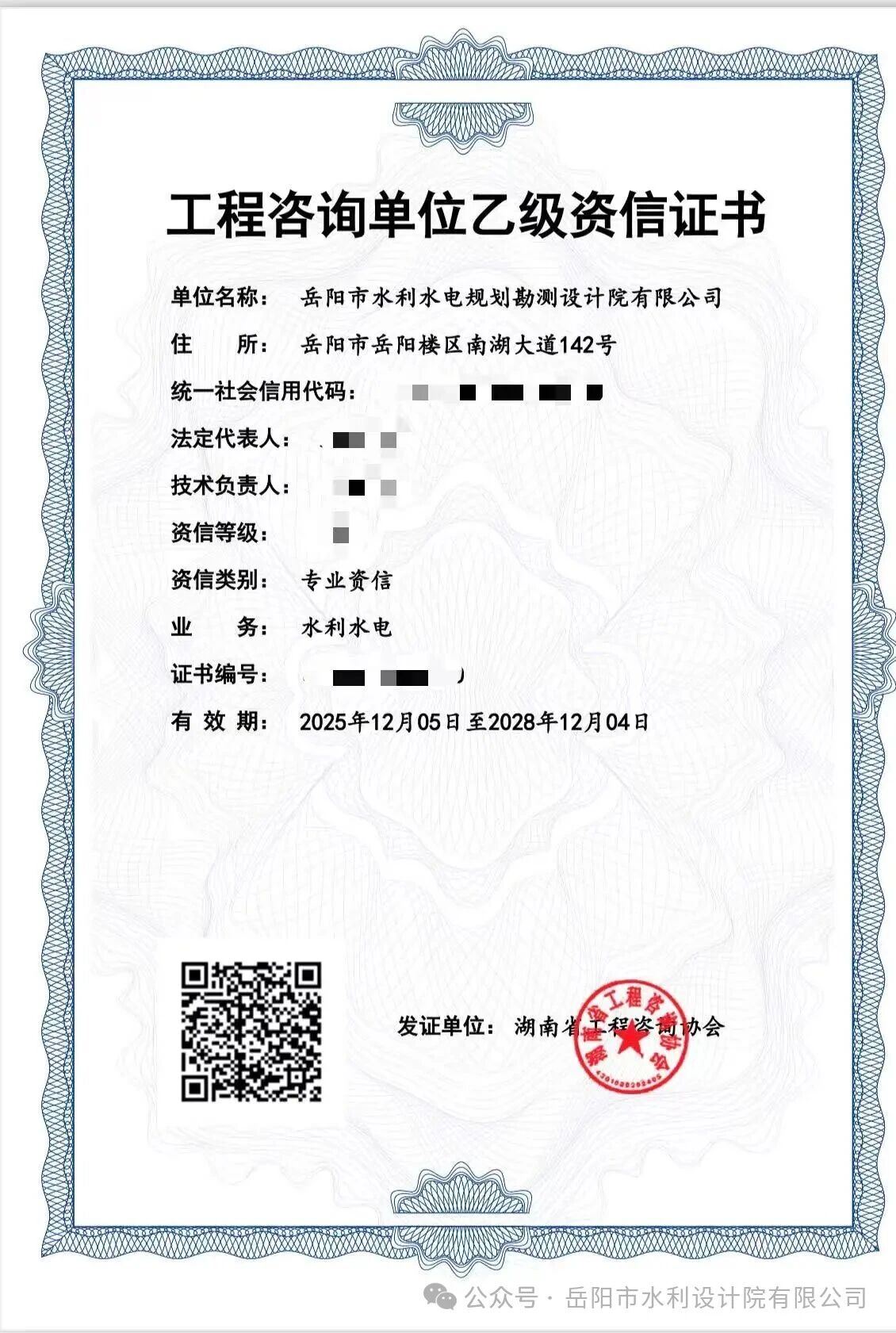 近日,岳阳市水利水电规划勘测设计院有限公司顺利通过湖南省工程咨询协会评审,取得工程咨询单位乙级资信证书(水利水电专业)。