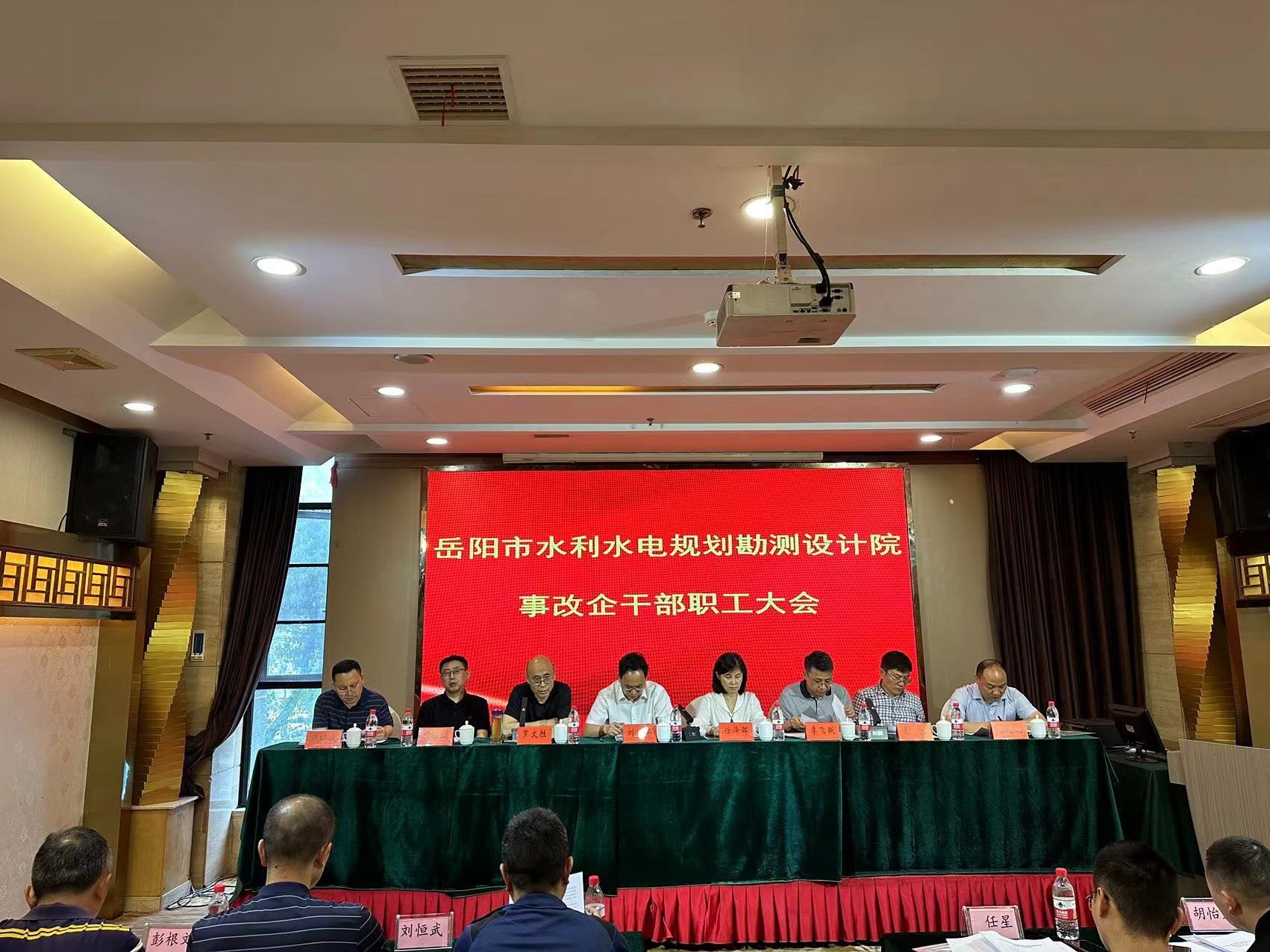 2023年5月15日下午3点,岳阳市水利水电规划勘测设计院在国贸邦城大酒店召开了事改企干部职工大会,市水利局局党组成员、副局长刘固华、局人事科任泽晖到会进行指导。
